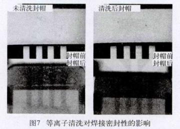封帽前清洗優(yōu)化焊接面蓋板封帽作為電路陶瓷封裝工藝中的后道關(guān)鍵工序,其密封性以及蓋板和焊環(huán)的焊接強(qiáng)度直接影響電路的可靠性和使用壽命。取兩只焊環(huán)表面有微量沽污的電路,一只用N2/H2,等離子體清洗20min,另一只不作清洗,在同樣的工藝條件下進(jìn)行合金封帽,最后用x射線檢測(cè)焊接面焊接情況。圖7所示為封帽前后的圖片和x射線圖像。