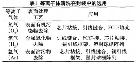 等離子體清洗在半導(dǎo)體封裝領(lǐng)域應(yīng)用廣泛。根據(jù)材料表面氧化、助焊劑殘留、樹(shù)脂殘跡、有機(jī)物等不同沾污物的性質(zhì),選擇相適應(yīng)的氣體,清除掉這些污染物,從而顯著地改善封裝可制造性、可靠性及提高成品率,表1是等離子體清洗工藝的應(yīng)用。