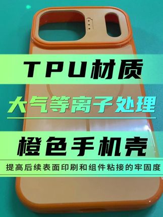 TPU橙色手機(jī)殼等離子處理,大氣等離子清洗機(jī)處理TPU手機(jī)保護(hù)殼,提升后續(xù)組件粘接和印刷牢固度。