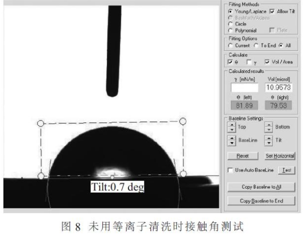 對LED封裝工藝前添加射頻等離子清洗,測量鍵合引線的拉力強度,與未進行射頻等離子清洗相比,鍵合引線拉力強度有明顯增加,反映基板及芯片進行射頻等離子清洗后是否有清洗效果的另一個檢測指標為其表面的浸潤特性,浸潤特性的提高表明在封裝工藝前進行射頻等離子清洗是十分有益的。
